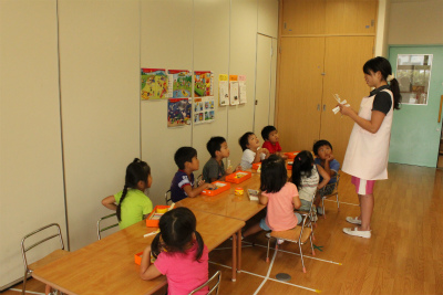 8月も終わり9月に突入!! ということで、今日の幼稚部さんは9月の製作を行いました♫ まずは、先生の話を聞いて・・・ ハサミで紙コップをチョキチョキ・・・✂ 切ったところを開いて…