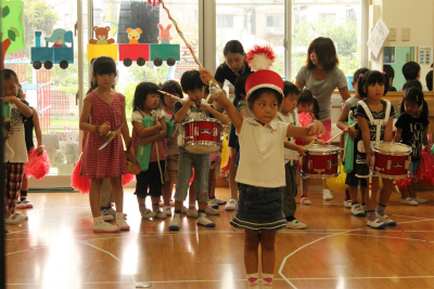 「先生おはよう」とみんな元気に登園です(^O^)/ 今日はパンダ組、キリン組、ライオン組は、マーチングの練習です(^_^)v 先生が「始まるよー」と言うとみんな張り切って自分が使う物を持って来ます!パンダ組…
