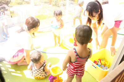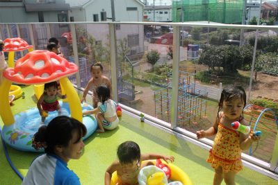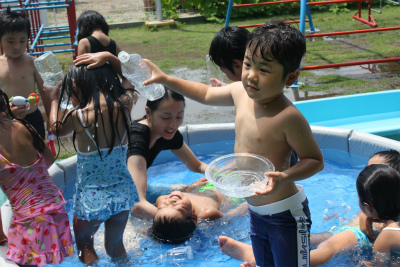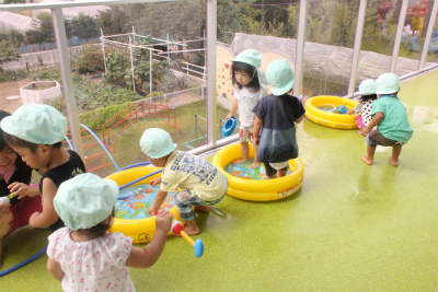 今日はプールの日(*^_^*)テラスや園庭に用意されているプールに朝から大喜びの子どもたちでした♪ ラッコ・ペンギン組★ お水をチャプチャプしたり、ジョーロでお水を流してみたり楽しそう イルカ組★ 手をつないでジャンプジ…