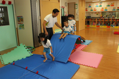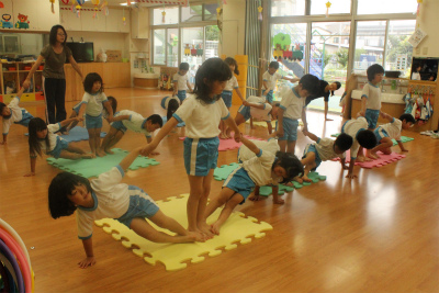 今日も暑さに負けないなかよし保育園のお友だち! 今日の幼稚部のお友だちは、大好きなてっちゃん先生の体操教室でした。 マットを使ってのすべり台にみんな大興奮です♪ すべり台のあとは…