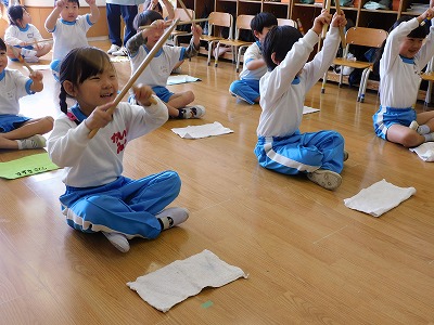今日はキリン組の様子です 音楽指導もあったので子ども達は福富先生と鍵盤ハーモニカや バチ指導を取り組みました 音楽指導の前にキリン組に実習で来ている先生に 絵本の読み聞かせをしてもらい、お話に興味を示しながら 見ていまし…