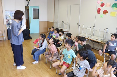 今日はお月見会を行いました。 先生からお月見の由来を興味深そうに聞いていました。 お話の後は「月にうさぎがいるりゆう」というお話を大きなスクリーンで見ました。 映画…