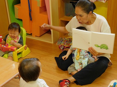 今日はラッコ組の様子です 午前中はテラスで水遊び行いました 桶の中に水をため、水の中に手を入れて水しぶきをあげたり 水遊び用のおもちゃを使って楽しんでいました 水遊びをした後は給食の時間です 先生が絵本の読み聞かせを行う…