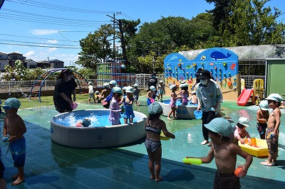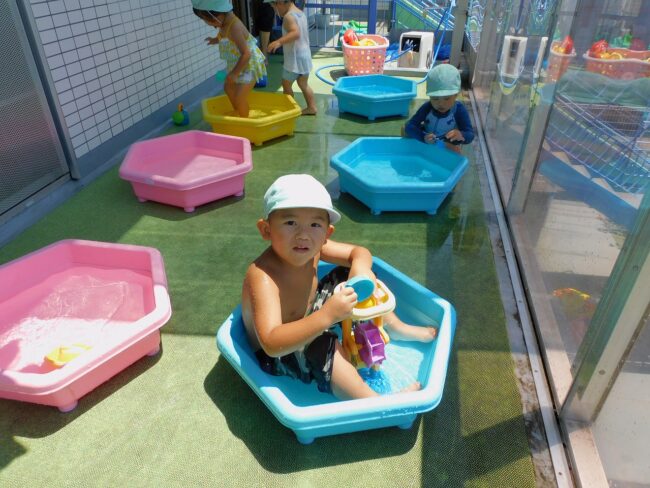 今日はイルカ組の様子です 午前中はゆりこ先生の英語指導がありました その後、テラスで水遊びを行いました それぞれ、小さな桶に入り友達と遊びを楽しむ姿が見られていました 今日も暑さがあり、子ども達は水遊びを思い切り楽しんで…