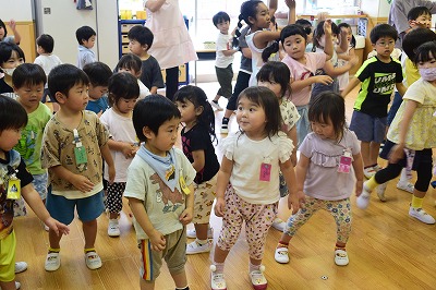 イルカ組さんは、幼稚部さんと一緒に盆踊りの練習を行いました(^^♪ ドラえもん音頭とコバトン音頭を踊りました! 先生やお兄さん、お姉さんの動きを見ながら上手に真似をして 踊ることが出来ていました(^^)/ 夏祭りが楽しみ…