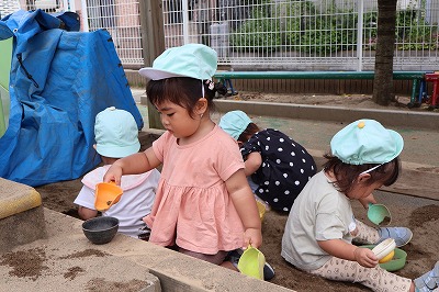 今日はペンギン組のお友達が、園庭で遊びました。   お砂場で、カップにお砂を入れて、お友達や先生と一緒に楽しく遊んでいます。       お皿や、カップに入れることもとても上手にな…