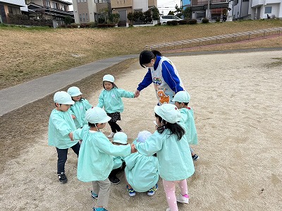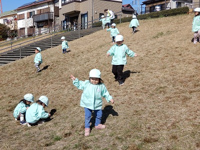 今日はペンギン組のお友達が、イルカさんと一緒に治水緑地までお散歩に出かけていました。 イルカ組さんに手を繋いでもらうと、嬉しそうに歩きだしました。 治水緑地では、芝の坂を元気に駆…
