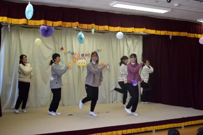 今日は2月のお誕生日会がありました 今月も誕生児の子ども達が舞台に上がり、インタビューや 保育者からの誕生日カードのプレゼントなどをもらいました 保育者の質問に緊張したり、考えたりしながら答える姿が見られました 大きな声…