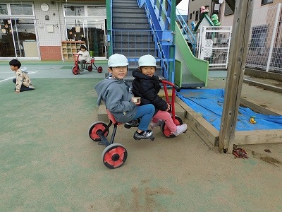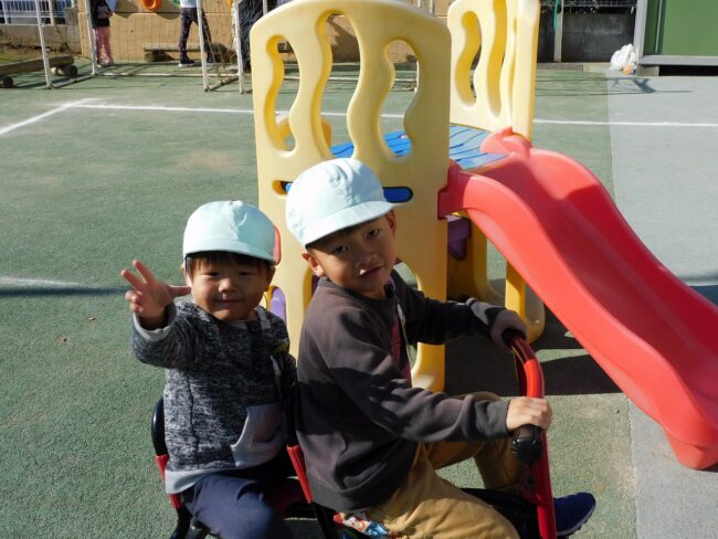 今日は園庭で遊びました。 みんなで体を温めるために追いかけっこをしたり、 遊具を叩いてどんな音がするか楽しんだりしました♪ 叩くと鐘のような音が出たので 「カンカンなってるよ!」…