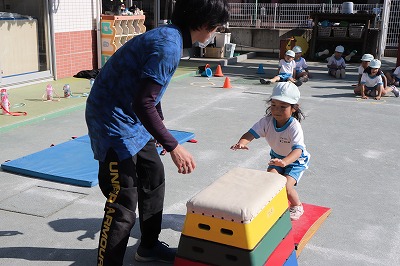 キリン組のお友達は今日は体操指導に参加しました。 跳び箱の練習が始まっているので、準備体操も念入りに行っています。 跳び箱は台上前転の練習をしています。 手をつく位…