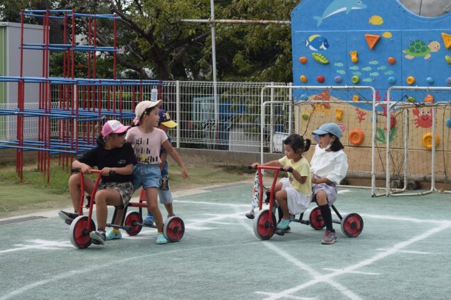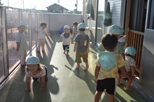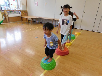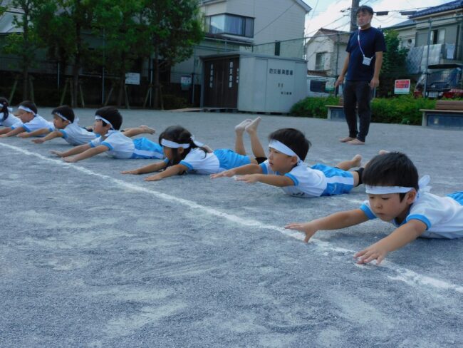 本日はキリン組の様子です 午前中は「桃の木公園」で体操指導があり、運動会に向けた組体操を取り組みました いつもは園庭で取り組んでいますが、小学校と同じような砂利の地面での場で取り組むことが出来ました 裸足で地面の熱さを感…