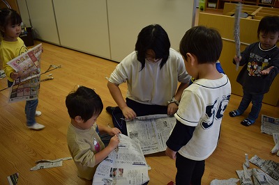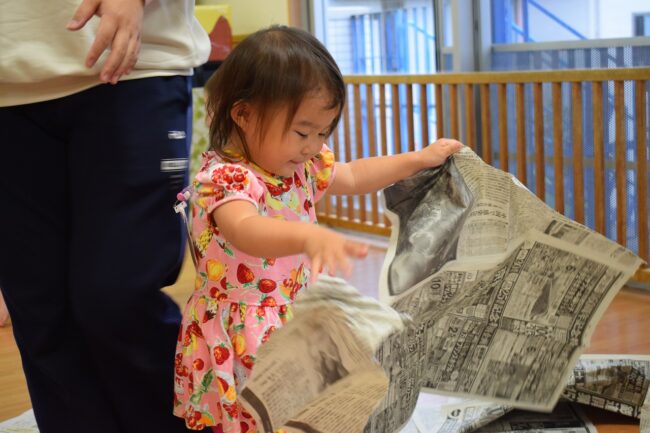 今日はイルカ組のお友達が新聞紙遊びを楽しみました。 大きな新聞紙をどうやったら半分にビリビリ破けるか、じっくり考えていました。 かっこい…