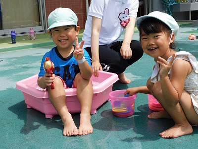 今日はイルカ組の様子です 午前中は少し蒸し暑い天気となりましたが、ベランダで水遊びを行いました 小さいプールの中に水を張り、足を入れて冷たさを感じたり、友達と遊びを 楽しむなどする姿が見られていました 水遊…