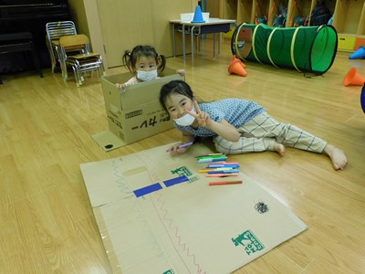 今日は、保育室内で過ごしました 午前中は、音楽に合わせて踊ったり、小さい三角コーンやトンネル、トランポリンを 使いサーキット遊びをしました 三角コーンを踏まないように足を「パー」に広げ、ジャンプしています …