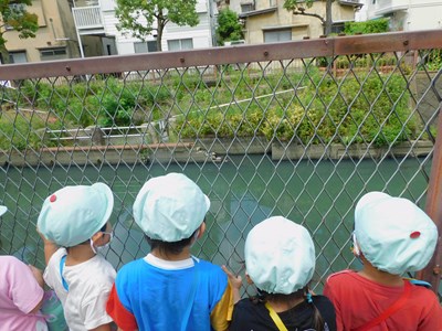 今日のイルカ組は、竜居川沿いをお散歩しました 川沿いを歩くと子どもたちは、お魚や何かいないか覗く姿があります 川を覗いてみると、そこにはたくさんのカメがいました 10数匹ほど辰井川を泳ぎに来たのか、どこかに行くのか 子ど…