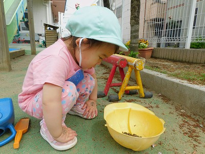 今日はみんなで園庭に出て遊びました! 幼稚部のお友達は素早く動くありをたくさん 捕まえて、器の中に入れて観察していました! 保育部のお友達も気になったようで、 器の中のありをじっ…