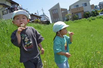 今日のキリン組は、幼稚部さんで「治水緑地」までお散歩に行きました! 治水緑地では坂になっている草のところに子どもたちの興味を示すものがたくさんあります タンポポや春の草花を見つけ、友達と集めることで「花束」を作る姿もあり…