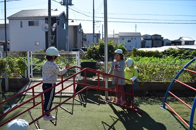今日はみんなで園庭で遊びました! ラッコ組のお友達は数歩ですが歩けるように なり、探索やすべり台を先生と一緒に 楽しんでいました♪ 幼稚部のお兄さん、お姉さんはつり橋で じゃんけ…