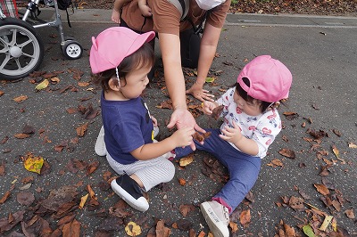 今日ラッコ組のお友達は 園の周りをお散歩しました♪ 先生と手を繋いで歩いたり カートに乗ってお散歩を楽しみました☆ 落ち葉がたくさんあり…