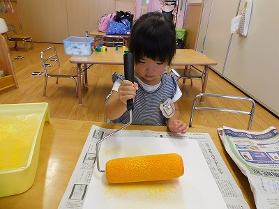 今日イルカ組のお友達は お月見の制作を行ないました! 絵の具とローラーを使って 制作をしていきます! 黄色の絵の具がパーッ…