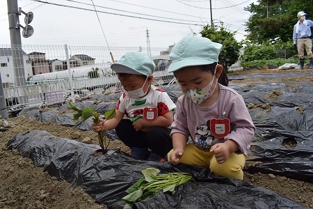 今日はさつまいもの植え付けを各クラス行ないました☆ 先生に植え方を教えてもらい、一生懸命植えていました! 幼稚部のお友達は、「早くさつまいもができない…