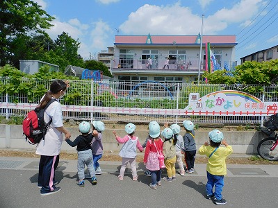 今日イルカ組のお友達は園周りのお散歩をしました☆ 2階のテラスにいたお友達や先生に 「いってきまーす!」と手を振り出発です♪ 広い場所に来るとみんなで…