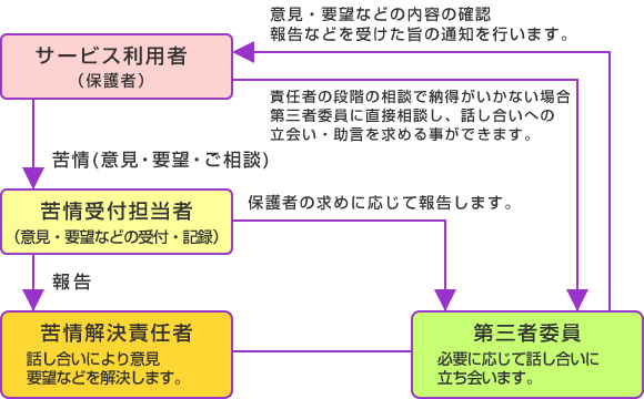 苦情は面接、電話、書面などにより、苦情受付担当者が随時受け付けます。なお、第三者委員に直接苦情を申し出ることもできます。