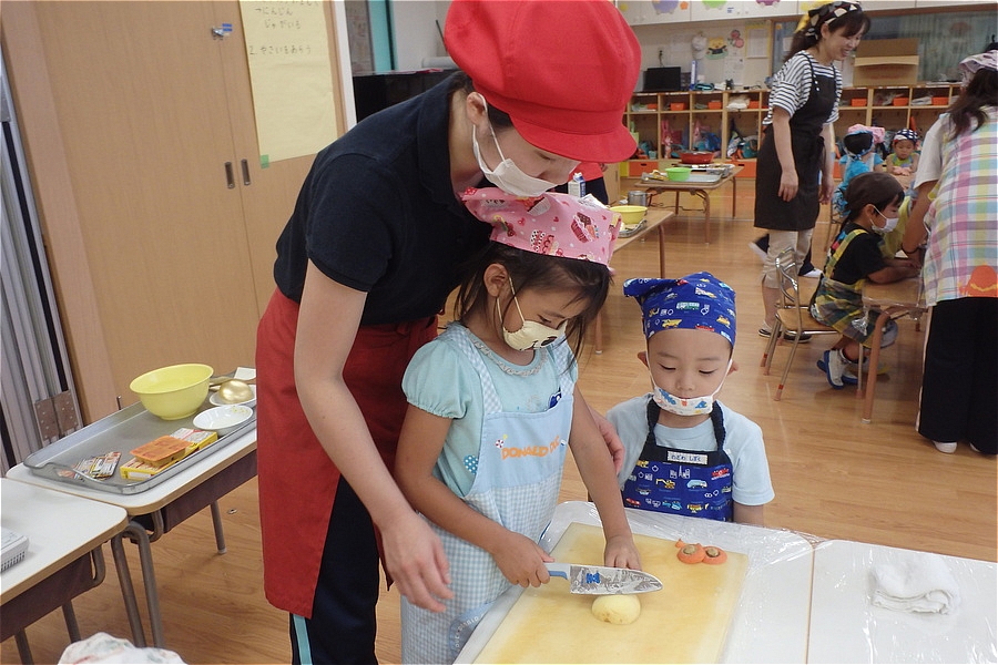 7月20日に園庭開放がありました。 今回はすいかわりをしました。 みんな上手に叩くことが出来ました。最後は保護者の方に割ってもらい、大歓声でした。 最後はおいしく食…